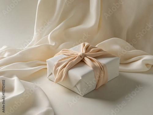 gift box, wrapped, elegant, simple, present, decoration, celebration, surprise, minimalist, stylish, bow, textile, cosy, holiday, birthday, special occasion, gift wrapping, aesthetic, luxury, design, white, beige, fabric, presentable, festive, charming, artistic, arrangement, photo, composition, serene, beautiful, smooth, texture, clean, modern
