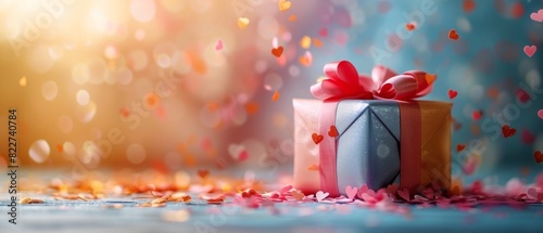Beautifully wrapped gift box with pink ribbon and heart-shaped confetti, perfect for celebrations, birthdays, and special occasions.