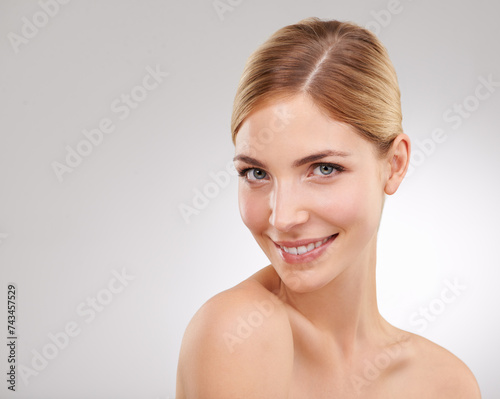 Beauty, cosmetics and portrait of woman with smile for skincare, confidence and facial on studio mockup. Dermatology, healthy skin and face of girl on white background with care, space and wellness.
