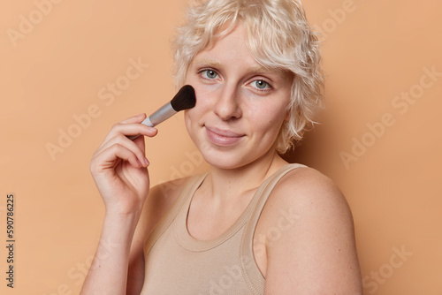 Beauty makeup and cosmetology concept. Lovely blonde Caucasian woman uses cosmetic brush has perfect soft skin green eyes applies powder on face wears t shirt poses against brown background.