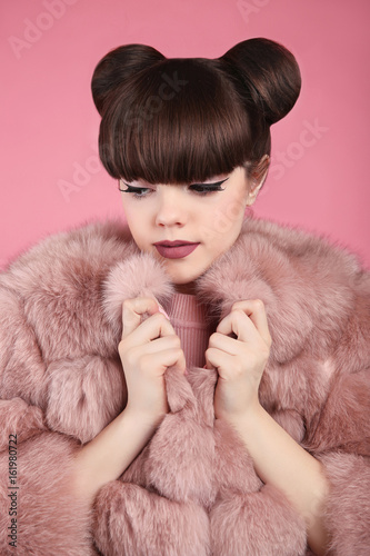 Beauty makeup. Fashion teen girl model in pink fur coat. Brunette with matte lips and bun hairstyle posing over studio background.