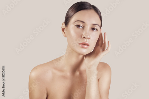 Beauty portrait of a very beutiful brown hair european young girl, nude make up. Studio shoot, white background.