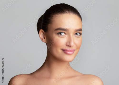 lifestyle, skin, summer, female, lady, person, rejuvenation, caucasian, attractive, pretty, cosmetology, woman, slim, young, studio, background, bare, no, camera, elegant, people, shoulder, pose, beautiful, girl, beautician, fashion, care, gorgeous, face, adult, grey, make-up, style, natural, hand, coiffure, model, look, elegance, beauty, naked, body, light, crop, portrait