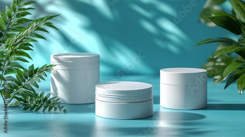 product, display, beauty, cosmetic, skincare, cardboard box, presentation, advertising, marketing, three-dimensional, illustration, design, modern, minimalist, plant, leaf, fern, green, blue, light, shadow, background, texture, cylinder, jar, container, promotion, shop, online, store, brand, studio, photo, clean, high
