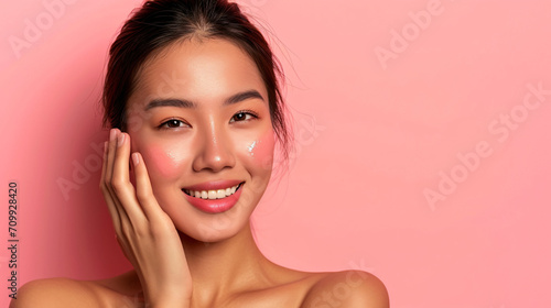 Beauty skin. Head and shoulders of asian woman model, touching glowing, hydrated facial skin, apply toner, skin cream or lotion for healthy look, after shower portrait, white background.
