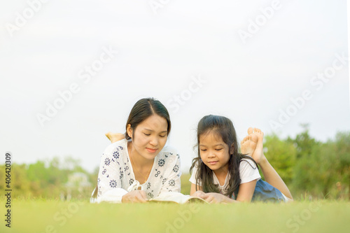 Beauty smiling mother and little sons reading book outdoor on green grass field
