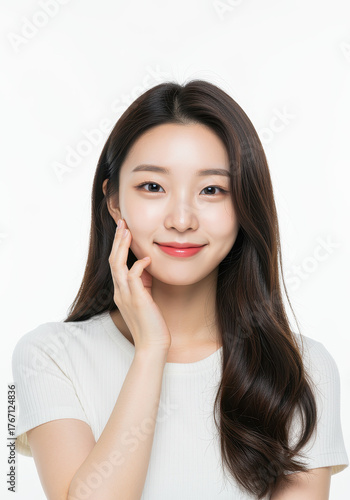 Beauty Unveiled: A captivating portrait of a woman radiating beauty, with her gentle touch accentuating the perfect symmetry of her delicate features.