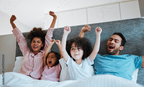 Bed, celebration and excited happy family watching tv show, children movie or bonding cheers for film. Home fans, morning kids and bedroom people scream for sports team, television or celebrate video