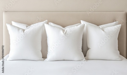 Bed Headboard Adorned with Plush Light-Colored Cushions. Generative ai