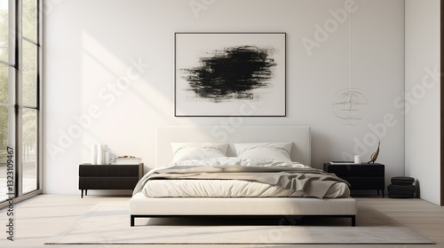 bed, white, modern, interior, illustration, minimalist, bedchamber, platform, linen, duvet, shag, rug, texture, warmth, abstract, focal, simple, space, wall, crisp, fluffy, decor, elegance, serene, monochrome, sleek, contemporary, clean, aesthetic, tranquil, sophisticated