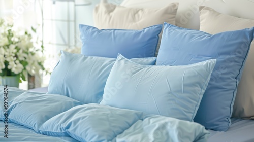 Bed with arranged blue pillows in close up shot