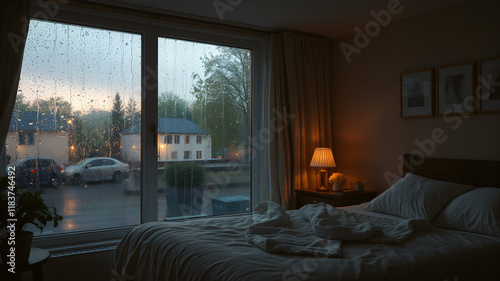 Bedroom on a quiet, unoccupied day. Cozy bedroom interior during a rainy evening through a window