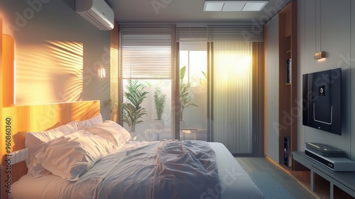 Bedroom with solar-powered devices and smart temperature control, focusing on sustainability, copy space