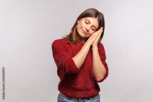 Bedtime. Portrait of girl in shaggy sweater sleeping laying down on her palms and smiling pleased, having comfortable nap and resting, dozing off. indoor studio shot isolated on gray background