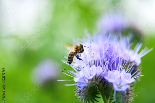 Bee and flower phacelia. Close up flying bee collecting pollen from phacelia on a sunny day on a green background. Phacelia tanacetifolia (lacy). Summer and spring backgrounds