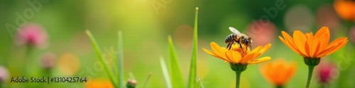 Bee flies over blooming flowers with green grass , wildlife, bee, cartoon