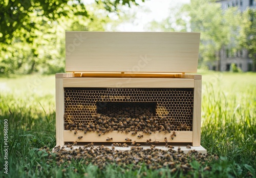 Bee hive full of bees on grassy field in sunny environment showcasing natural pollination and beekeeping practices for sustainable agriculture