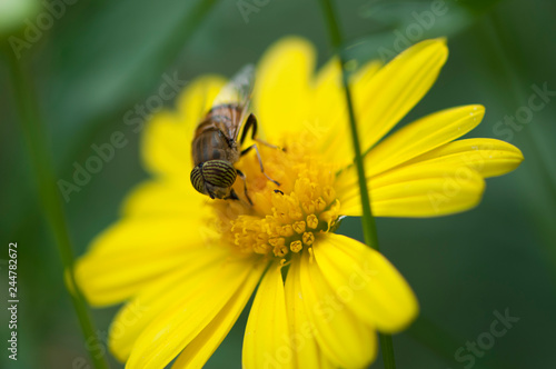 flower, insect, bee, yellow, nature, macro, fly, garden, summer, green, honey, spring, plant, pollen, bug, animal, closeup, daisy, blowball, flora, blossom, flower, beauty, closeup, nectar