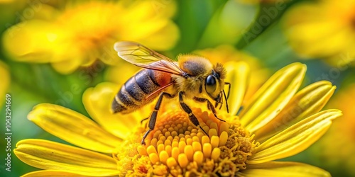 Bee pollinating a yellow flower with great sharpness and clean lines, aerial view