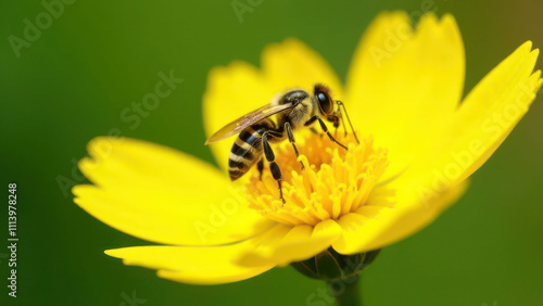 bee, pollinate, yellow, flower, vibrant, insect, pollen, nature, macro, closeup, green, background, nectar, garden, wing, bright, wild, environment, natural, life, biodiversity, outdoors, flora, fauna, blossom, detail, process, ecology, plant, species, tied-up, delicate, spring, summer, scene, field, pattern, sunlight, meadow, beauty, wildlife, detailed, buzzing, sharpened, ecological, essential