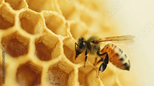 Bee pollination process near honeycomb nature close-up macro photography warm environment detailed view insect life