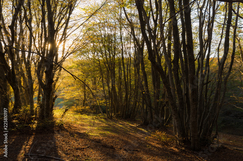 Beech trees in Canfaito forest (Marche, Italy) at sunset with warm colors, sun filtering through and long shadows