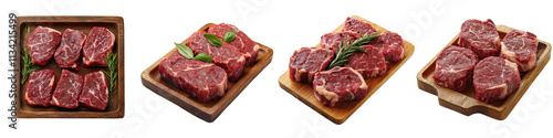 Beef steaks placed on a wooden tray, isolated on a white background. Collection PNG.