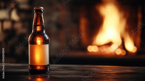 beer, bottle, blank, label, fireplace, table, beverage, drink, alcohol, night, wood, warm, fire, glow, cosy, amber, thirst, refreshment, relaxation, indoor, glasses, brown, still, life, quiet, home, evening, shadow, serenity, drinking, solitude, resting, flames, heated, decor, mood, design, scene, lifestyle, container, light, atmosphere, indoor, setting, rustic, background, copy space