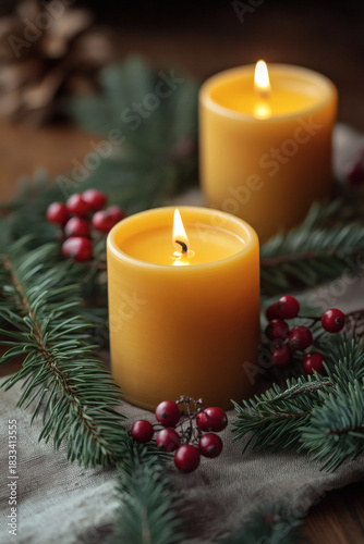 Beeswax candles with pine arrangement on wooden table