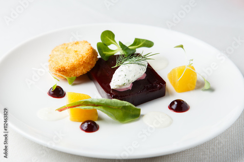 Beetroot terrine, goat cheese croquettes, horseradish sauce and dill cream on white dish