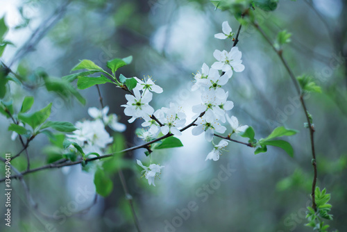 Beginning of spring. Fruit trees blooming on a blurred background.