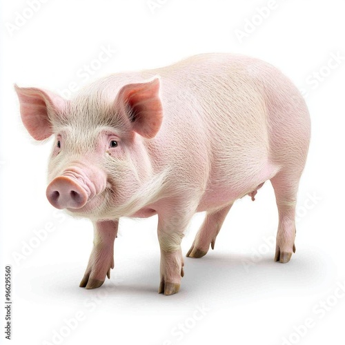 Behold a charming domestic pig, showcasing its round, pink body and expressive face, exuding a sense of contentment in a pristine environment.