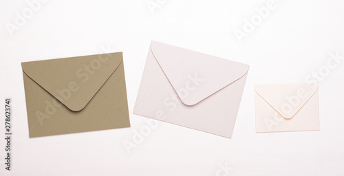 Beige and white envelopes on a white background. Concept of letters, messages, correspondence, copy space, top view, flat lay.