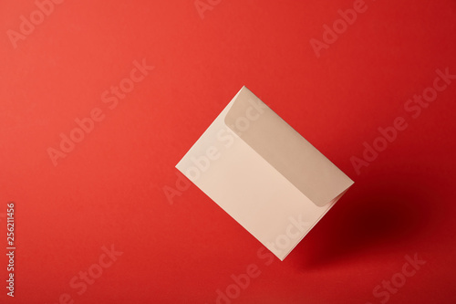 beige, blank and empty envelope on colorful red background with copy space