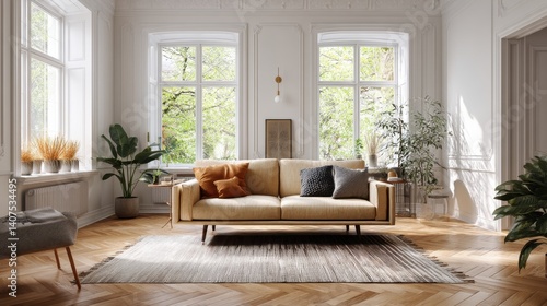 couch, sofa, living room, interior, home decor, sunlit, beige, natural light, window, plant, rug, modern, minimalist, comfortable, relaxing, bright, airy, stylish, home, house, apartment, design, furniture, pillow