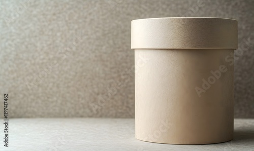 Beige cylindrical cardboard container on table.