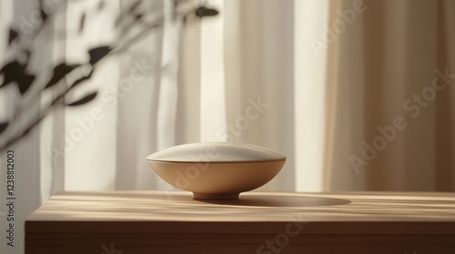 Beige diffuser on wood, sunlit room, calming decor, aromatherapy