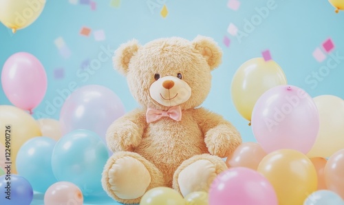 Beige Fluffy Teddy Bear with Colorful Birthday Balloons on Pastel Background, Happy Party Celebration Concept for Kids, Generative AI