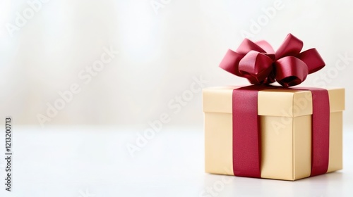 Beige gift box with maroon ribbon, on white surface, bright background, for holiday greeting cards