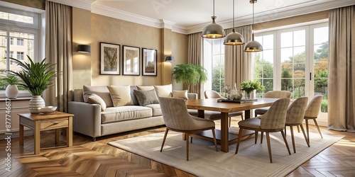 Beige home living room with dining table, cozy seating area, and large window, beige, home, living room, interior