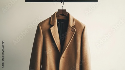 Beige suit fashion pieces on black hangers in luxury store stylish clothing rack display,modern fashion blog aesthetic,Business fashion,social media,shopping mall,sale online,Fashion blog.