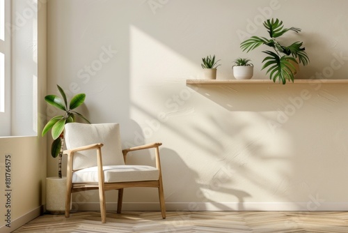 Beige wall background with wooden shelf, armchair and plants.