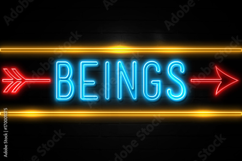 Beings - fluorescent Neon Sign on brickwall Front view
