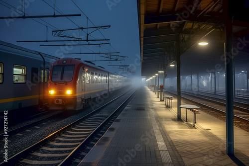 Beleuchteter Zug hält an einem Bahnhof bei Nacht und Nebel, Generative AI