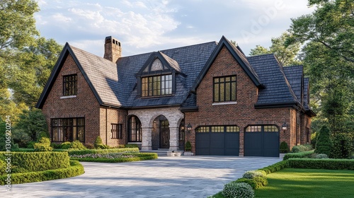 Belgian-style brick house with a slate roof, large bay windows, and a neatly paved driveway. Spacious copy space in the sky.