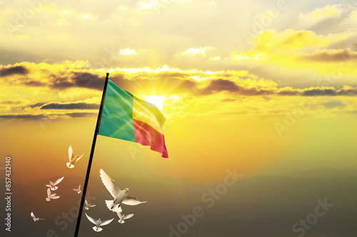 Benin flag waving with flying doves against sunset or sunrise. Benin flag for Republic Day and Independence Day.