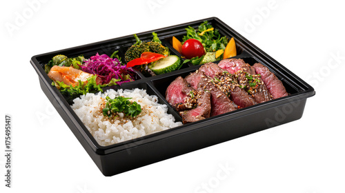 bento, box, meal, lunch, food, steak, beef, rice, white, green, red, purple, broccoli, cucumber, tomatoes, salad, garnish, sesame, seed, sauce, healthy, fresh, organic, delicious, epicure, japanese, asian, cookery, eatery, take-out, delivery, portion, nourishment, protein, carbohydrate, vegetable, cooked, prepared, diet, nourishment, tasty, savoury, meat, side, dish, assortment, variety
