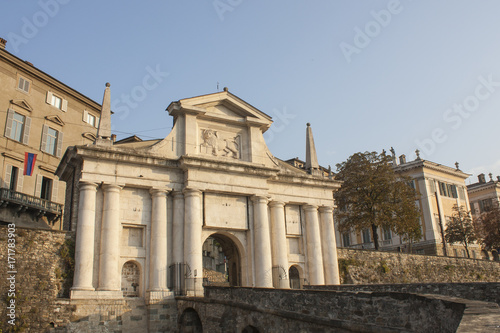 Bergamo - Old city (Citta Alta). One of the beautiful city in Italy. Lombardia. Landscape on the old gate named Porta San Giacomo during a wonderful blu day