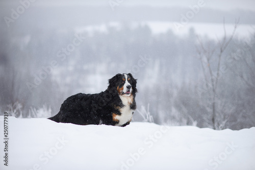 Berner Sennenhund big dog on walk in winter landscape