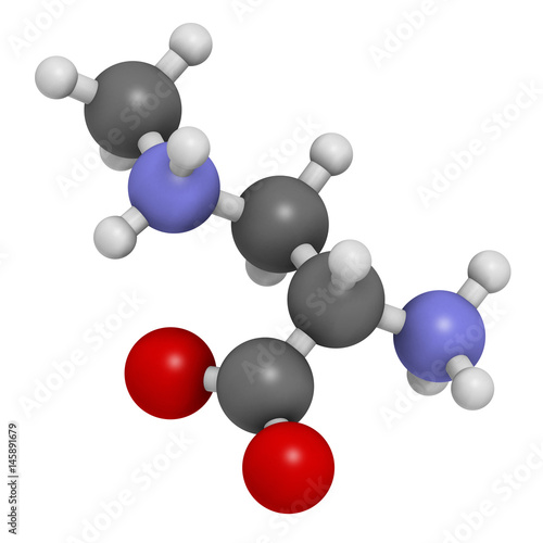 beta-Methylamino-L-alanine (BMAA) toxic amino acid molecule. Produced by cyanobacteria. 3D rendering. Atoms are represented as spheres with conventional color coding.
